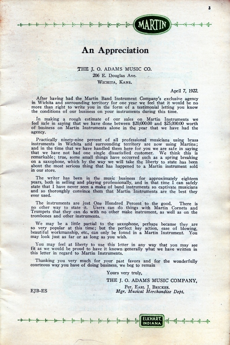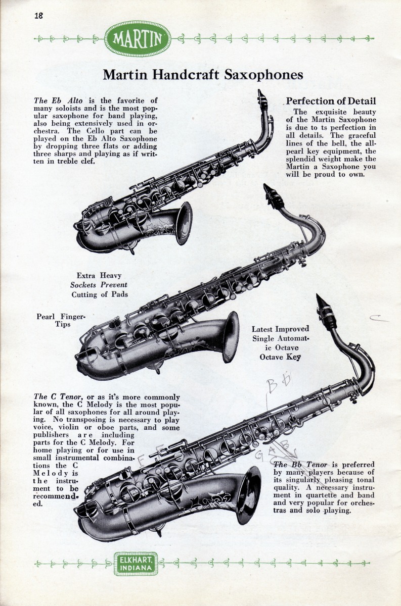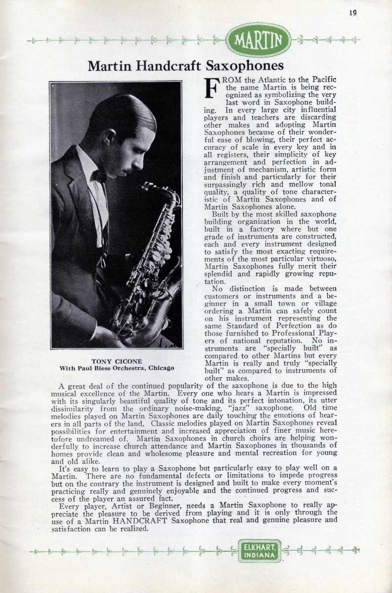 SUMMARY: A 1922 catalog containing Martin Handcraft saxophones in Bb Soprano, Eb Alto, C Melody, Bb Tenor, and Eb Baritone. There is a testimonial on the quality of the saxophones from Tony Cicone with the Paul Blese Orchestra in Chicago.