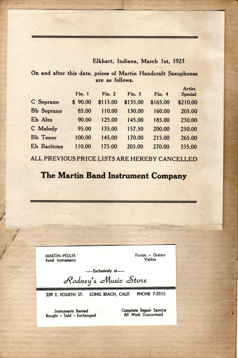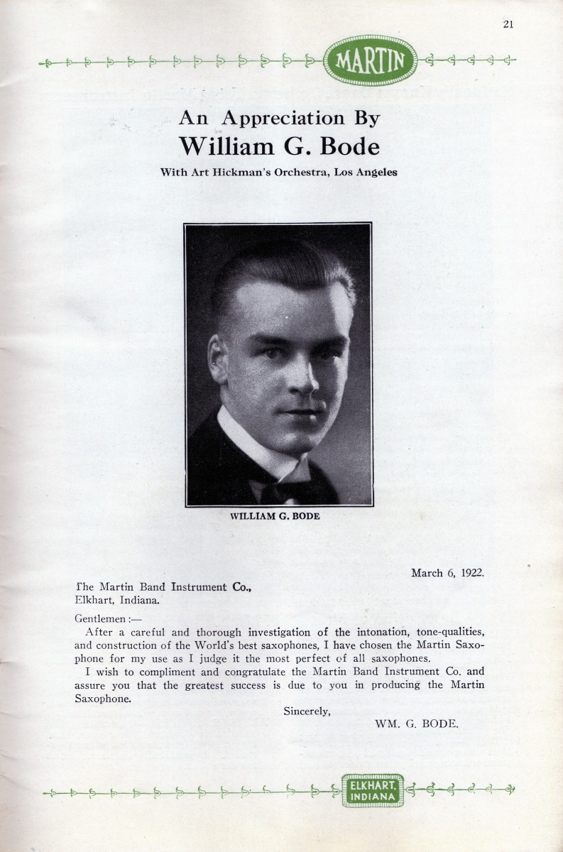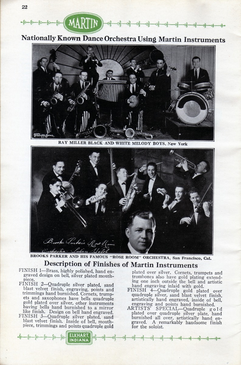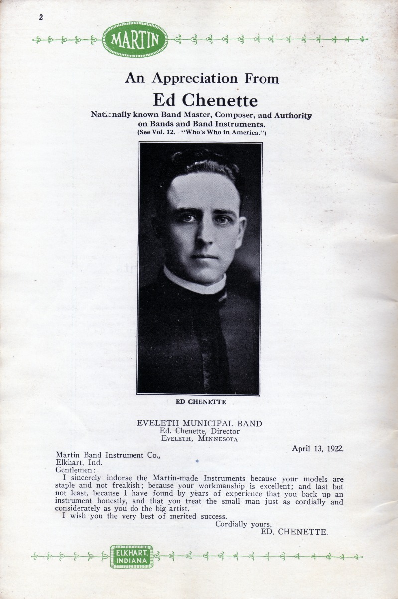 SUMMARY: A 1922 catalog containing Martin Handcraft saxophones in Bb Soprano, Eb Alto, C Melody, Bb Tenor, and Eb Baritone. There is a testimonial on the quality of the saxophones from Tony Cicone with the Paul Blese Orchestra in Chicago.