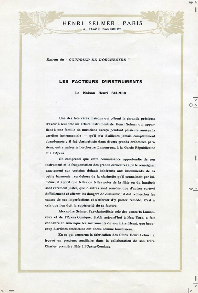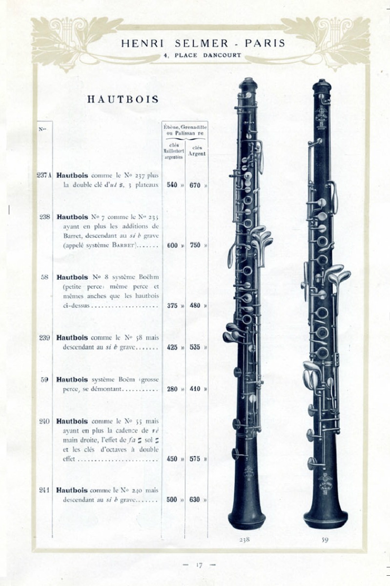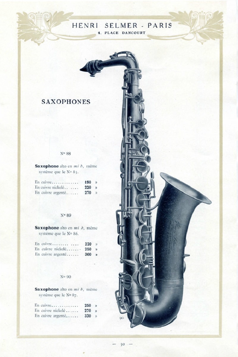 SUMMARY: An early catalog from Henri Selmer Paris, written in French from the workshop at Place Dancourt. The catalog features primarily clarinets and oboes, but also contains the No 85 - 96 B saxophones. This was a suite of saxophones available in soprano, alto, tenor, baritone, and bass.