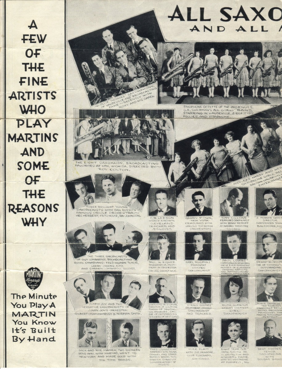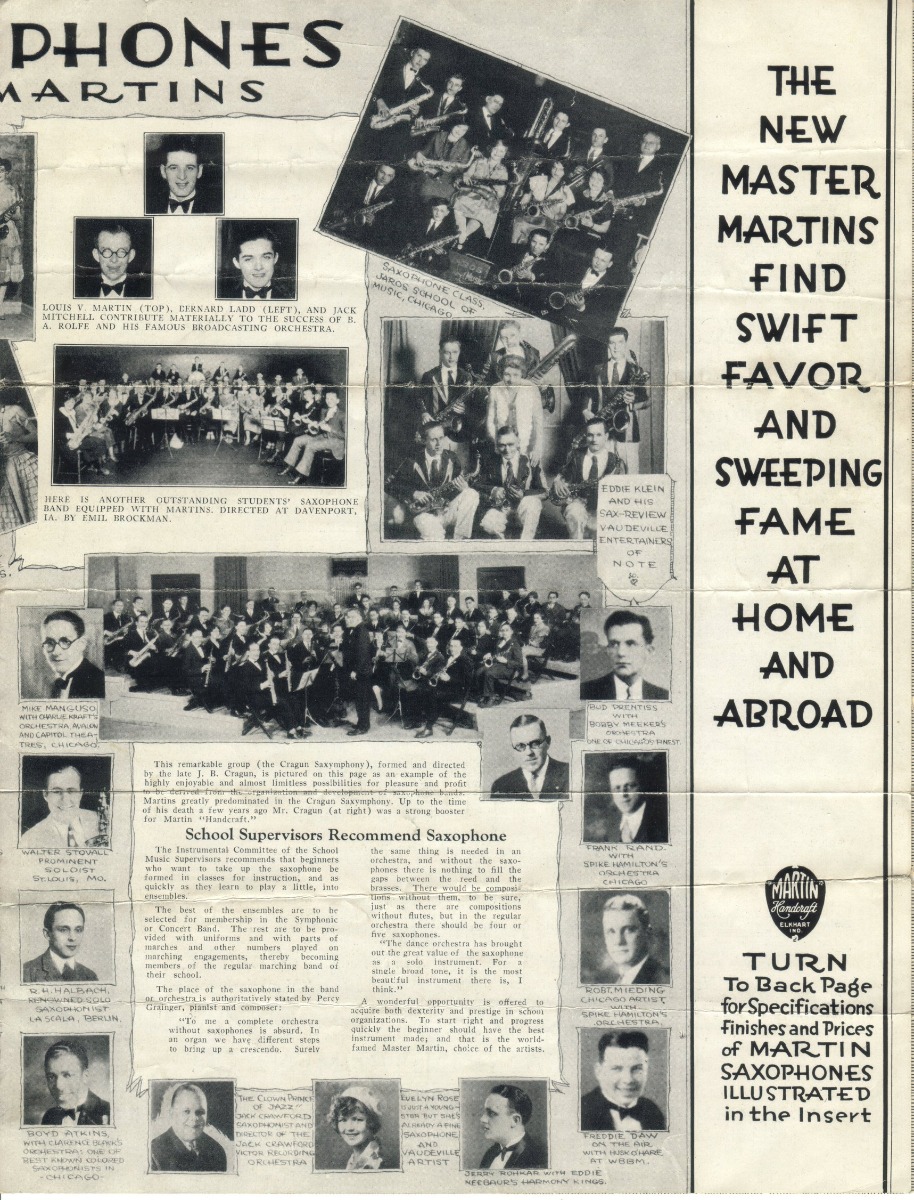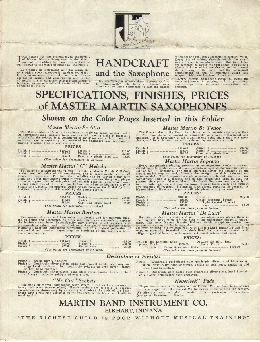 SUMMARY: A small 1927 catalog focusing on the Martin offerings of Handcraft saxophones in Bb Soprano, Eb Alto, C Melody, Bb Tenor, and Eb Baritone. They offer a variety of finishes, including the addition of the "De Luxe" gold finish with silver engraving. They argue that their "No Cut" sockets and "Neverleek" pads are the primary reasons to buy a Martin saxophone as well as the use of manual craftsmanship in tempering of the bells - giving rise to the name "Martin Handcraft."